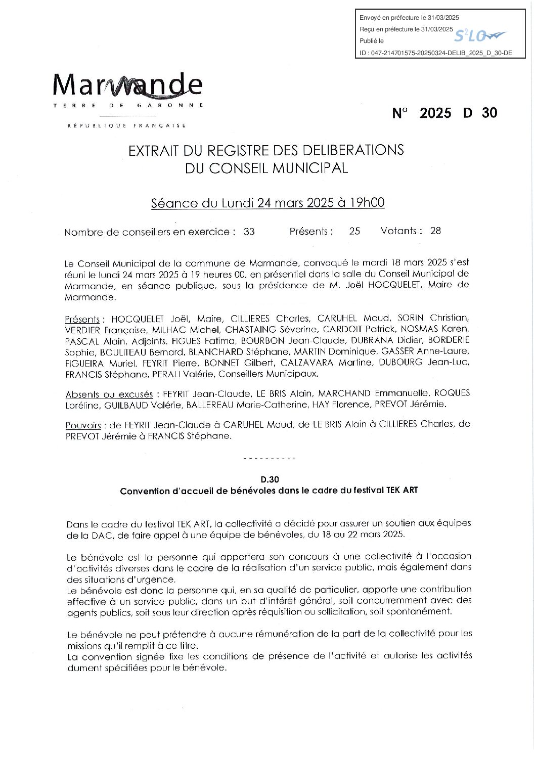 Délibération : 24 mars 2025 – Convention bénévoles TEKART