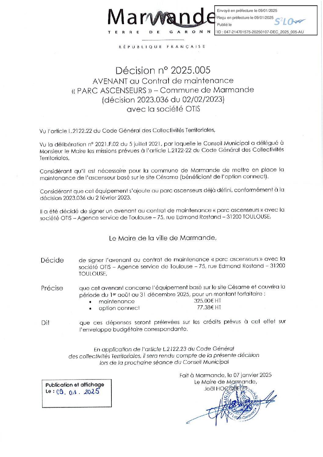 Décision : Décision 2025.005 – Avenant contrat de maintenance parc ascenseur OTIS