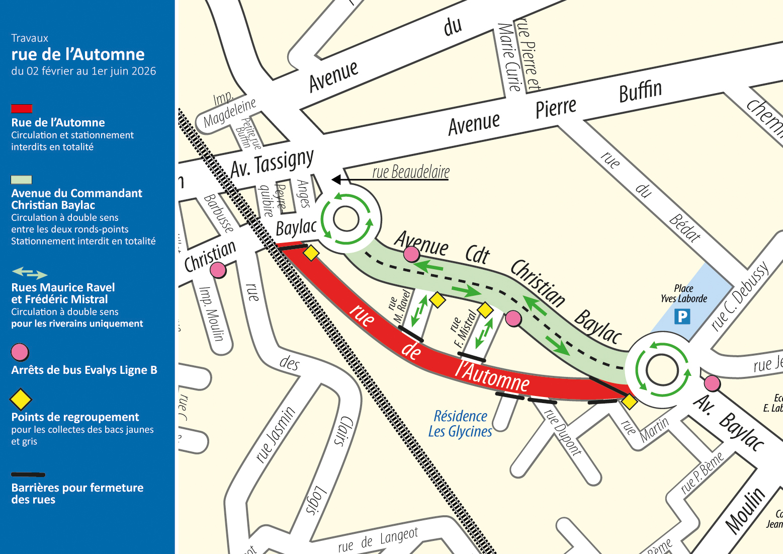 Les riverains concernés par les impacts du chantier, circulation, stationnement, fonctionnement du réseau de bus Evalys (ligne B) et collecte des déchets, sont informés directement par le biais d’un flyer distribué dans les boîtes aux lettres.