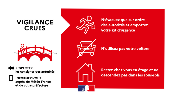 Face à la crue, conseils de comportement :
