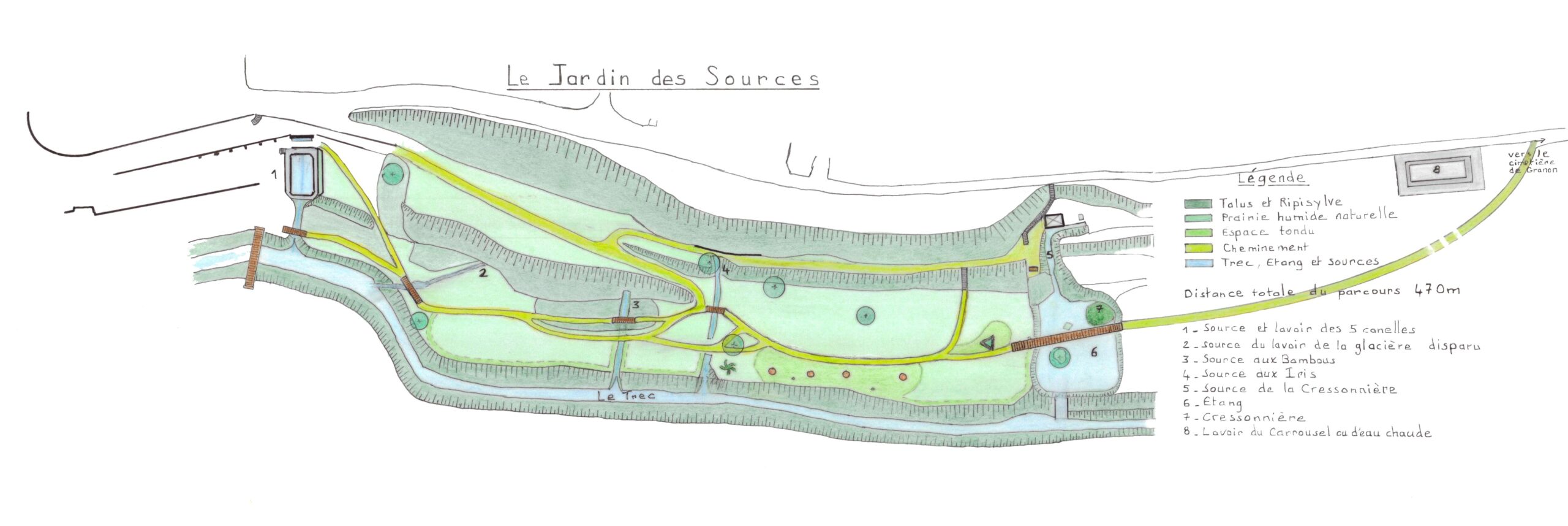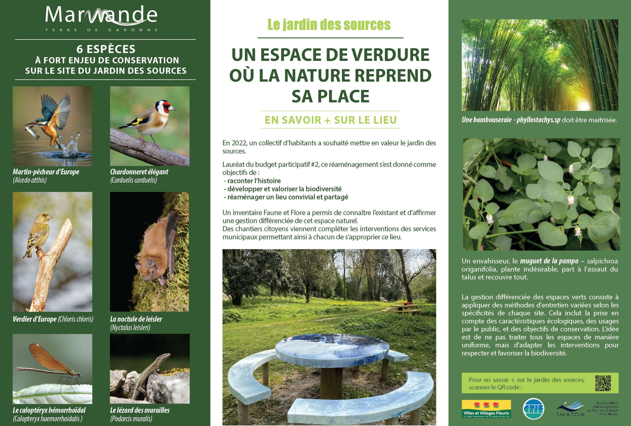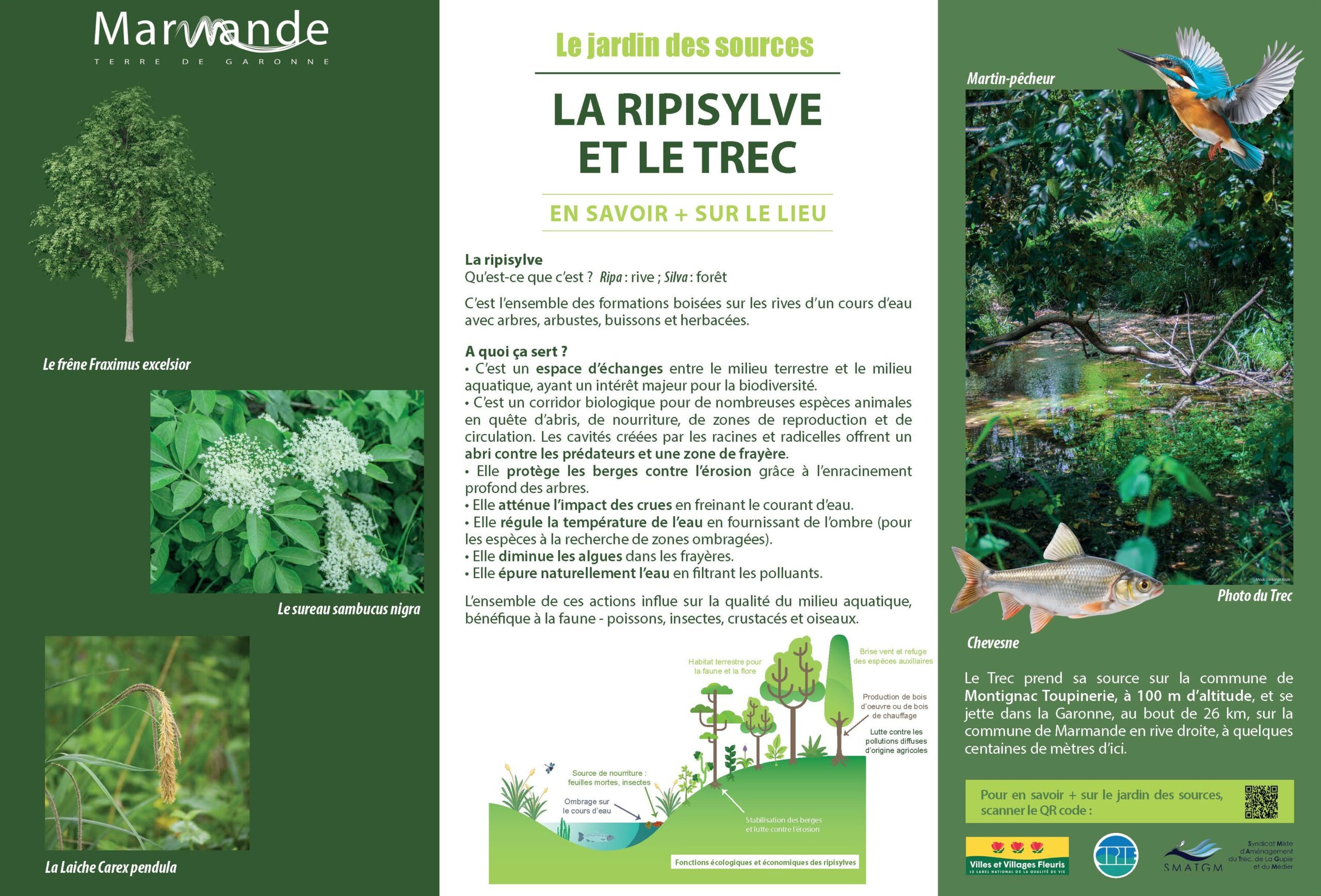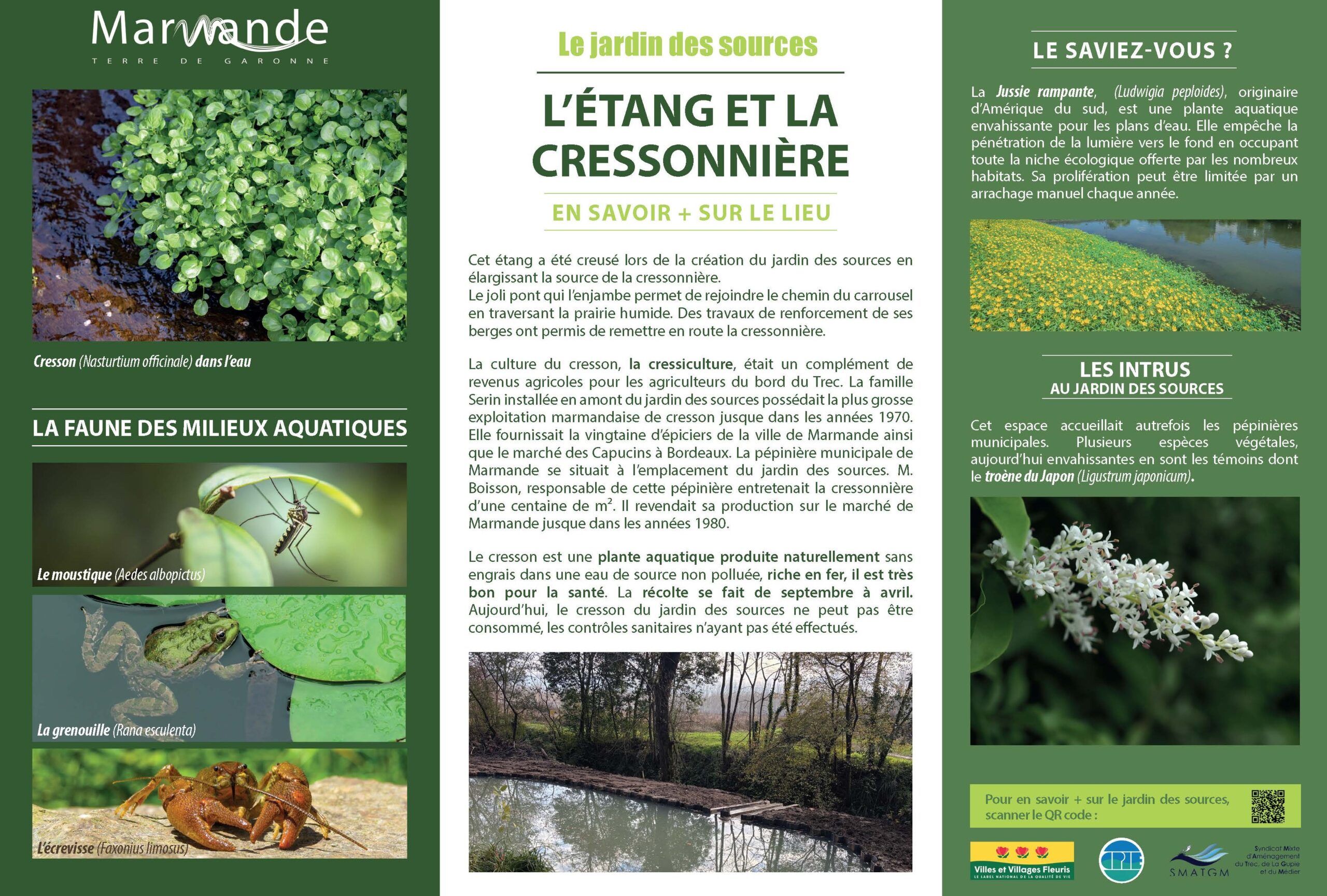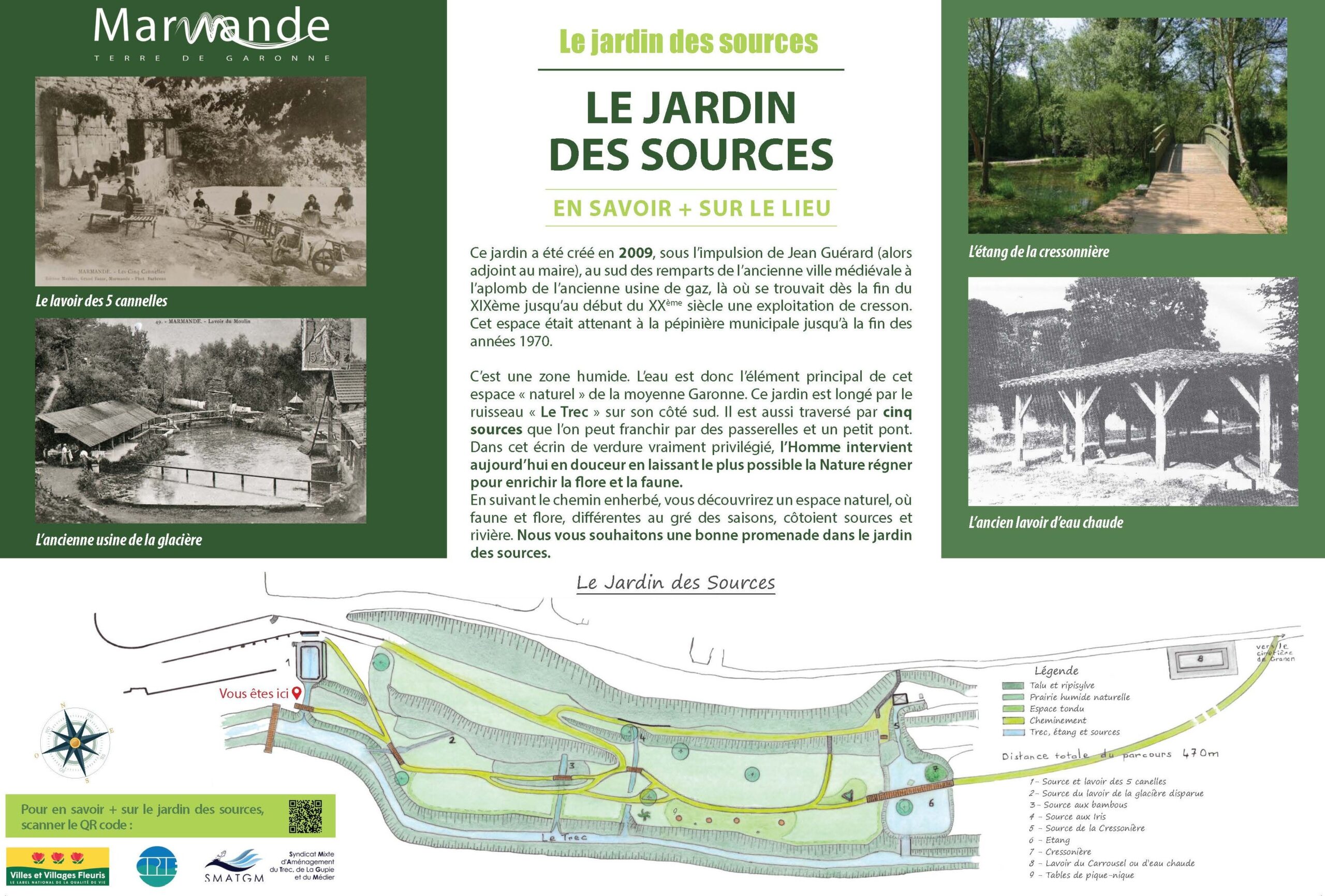 Créé en 2009 à l’initiative de Jean Guérard, alors adjoint au maire, ce jardin se situe au sud des anciens remparts de la ville médiévale, sur un site autrefois occupé par une cressonnière entre la fin du XIXᵉ et le début du XXᵉ siècle, puis par une pépinière municipale jusqu’aux années 1970. Cet espace naturel de la moyenne Garonne se distingue par son caractère humide, où l’eau joue un rôle central : il est bordé par le ruisseau du Trec et traversé par cinq sources accessibles grâce à des passerelles. Aménagé avec discrétion pour préserver la biodiversité, ce lieu offre une promenade paisible au cœur d’un écrin de verdure où faune et flore évoluent au fil des saisons.
