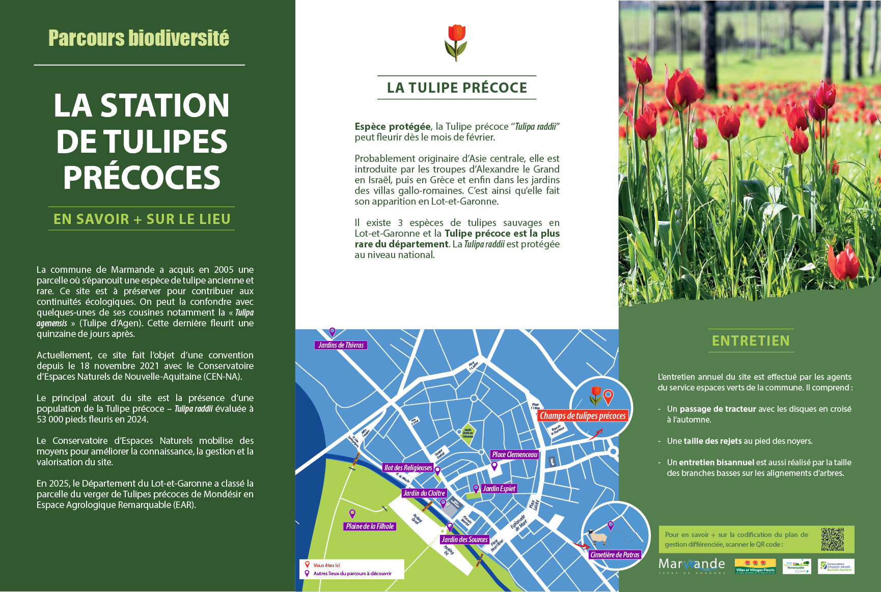 La commune de Marmande a acquis en 2005 une parcelle où s’épanouit une espèce de tulipe ancienne et rare. Ce site est à préserver pour contribuer aux continuités écologiques. On peut la confondre avec quelques-unes de ses cousines notamment la « Tulipa agenensis » (Tulipe d’Agen). Cette dernière fleurit une quinzaine de jours après.
