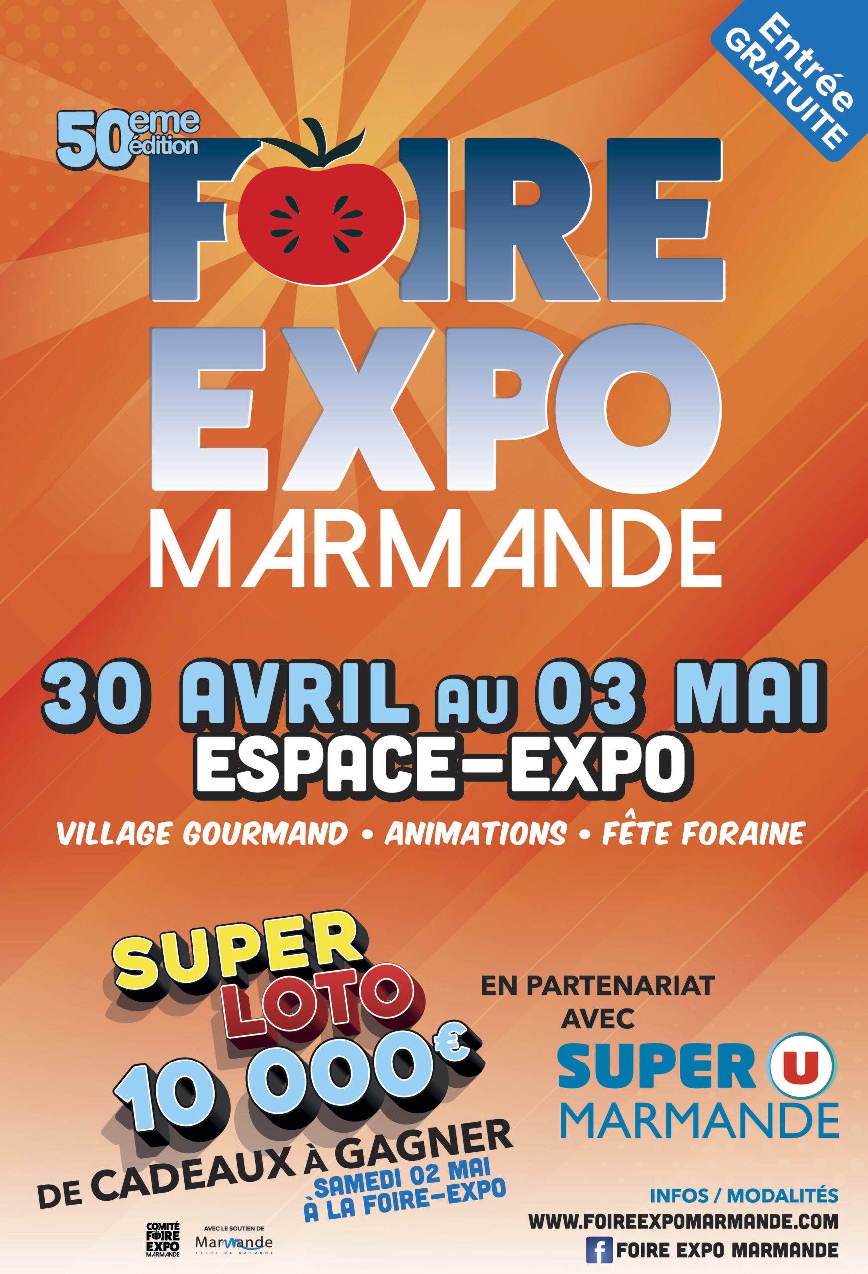 Au programme : un village gourmand, de nombreuses animations pour tous les publics et une fête foraine. Ne manquez pas le super loto du samedi 2 mai, avec 10 000 € de cadeaux à gagner, organisé en partenariat avec Super U Marmande.