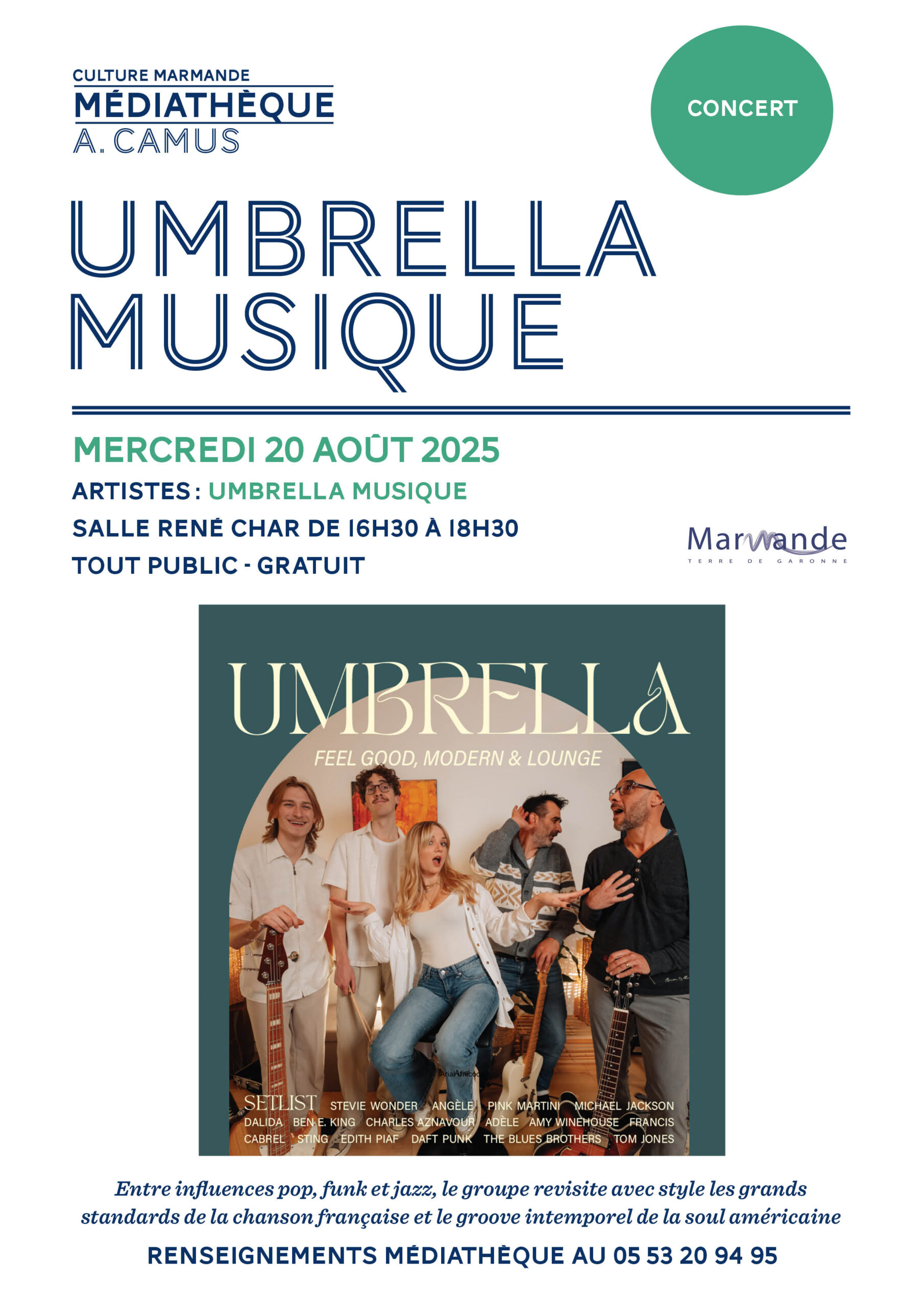 Venez vibrer au son d’Umbrella Musique, un groupe à l’univers généreux et métissé, qui mêle avec brio pop, funk, jazz et soul américaine. Le temps d’un après-midi, ils vous feront redécouvrir les grands standards de la chanson française, revisités avec modernité et élégance.