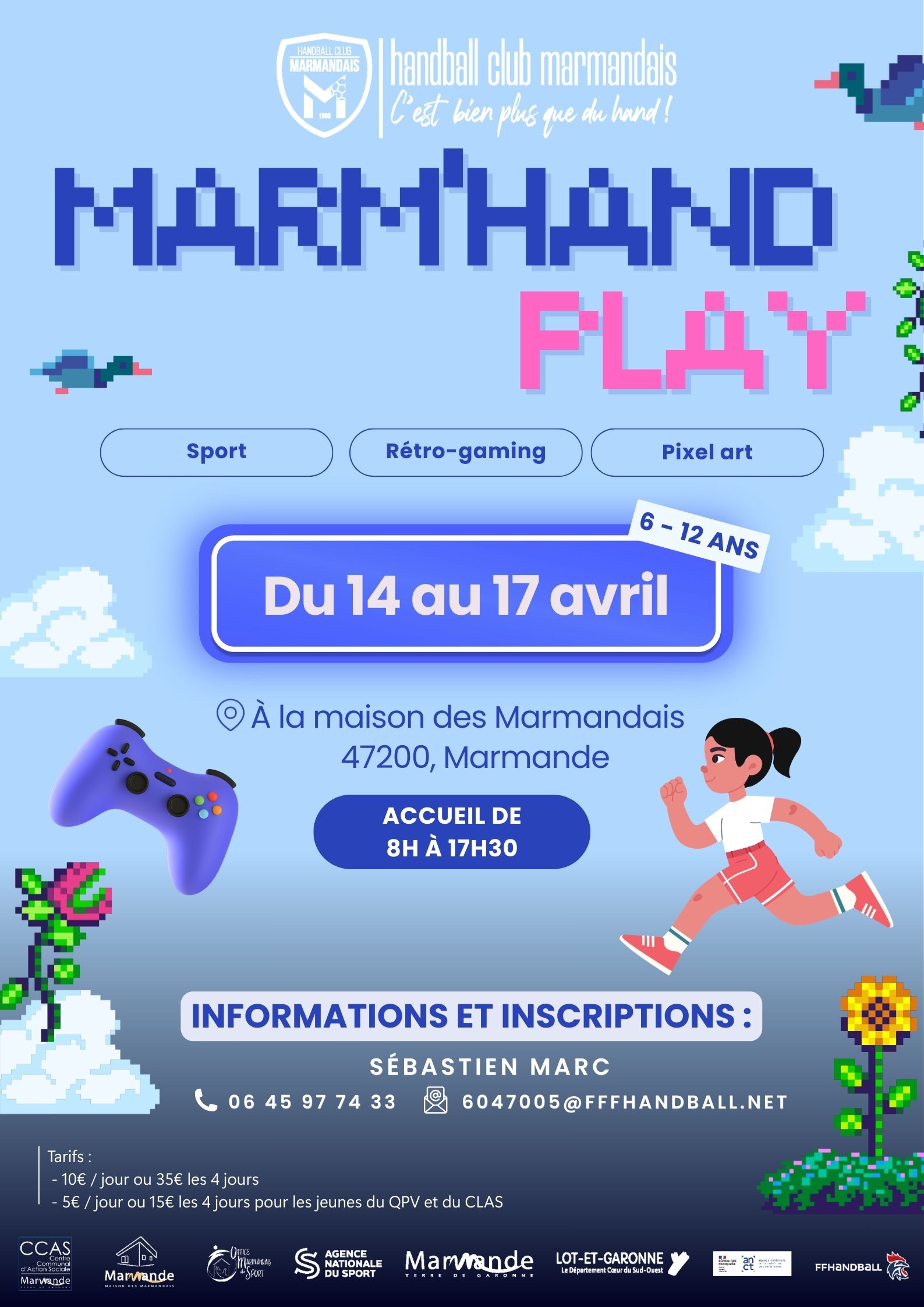 Ouvert aux enfants de 6 à 12 ans, ce stage propose une pratique du handball associée à la découverte d’autres activités sportives. Cette édition mettra à l’honneur une thématique originale autour du rétro-gaming et du Pixel Art.