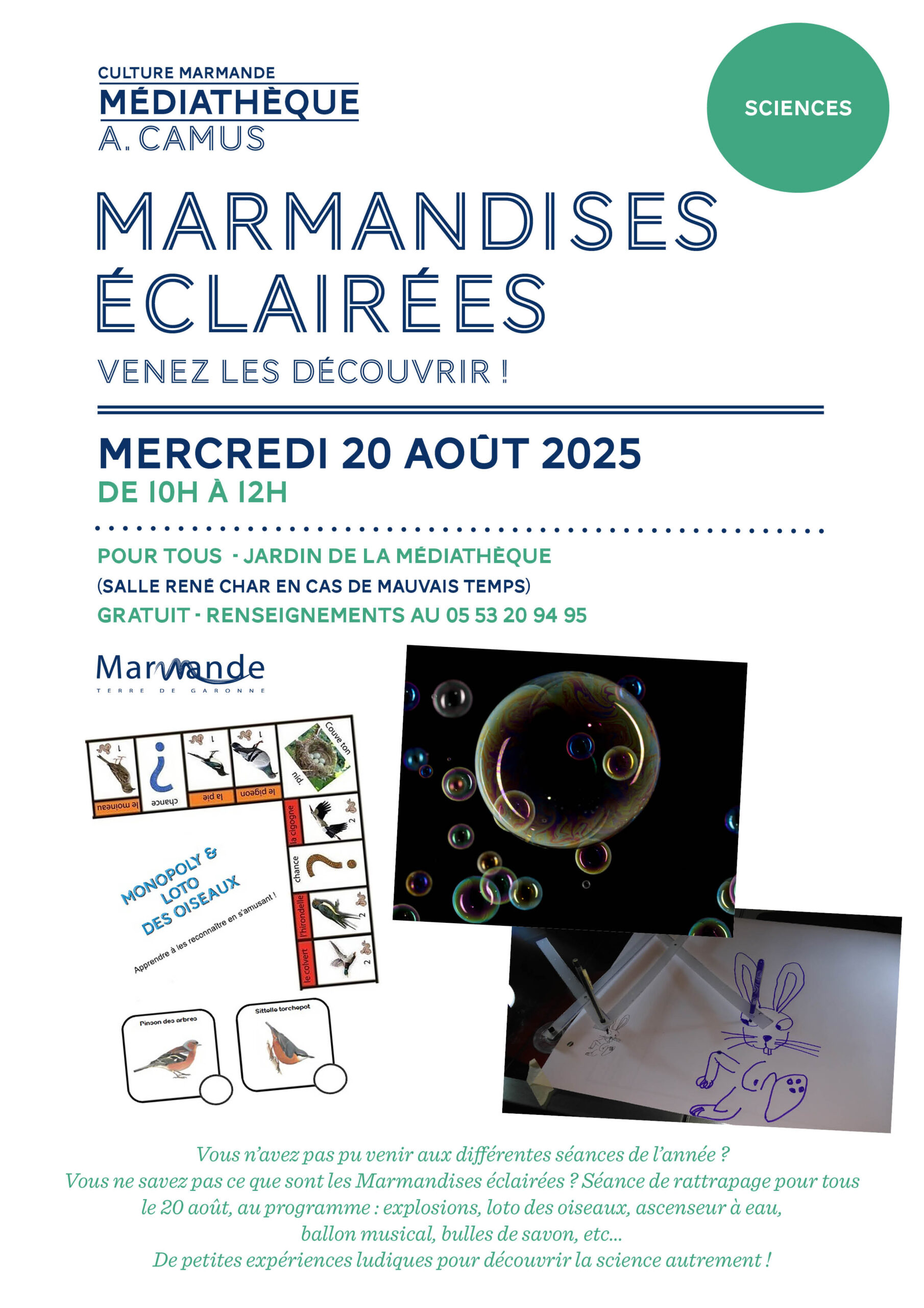 Mercredi 20 août, rendez-vous au jardin de la médiathèque pour une matinée pleine de surprises scientifiques. Petits et grands sont invités à explorer les sciences de façon originale et amusante à travers une série d’expériences ludiques : explosions (sans danger !), loto des oiseaux, ascenseur à eau, ballon musical, bulles de savon géantes et bien d’autres curiosités étonnantes.