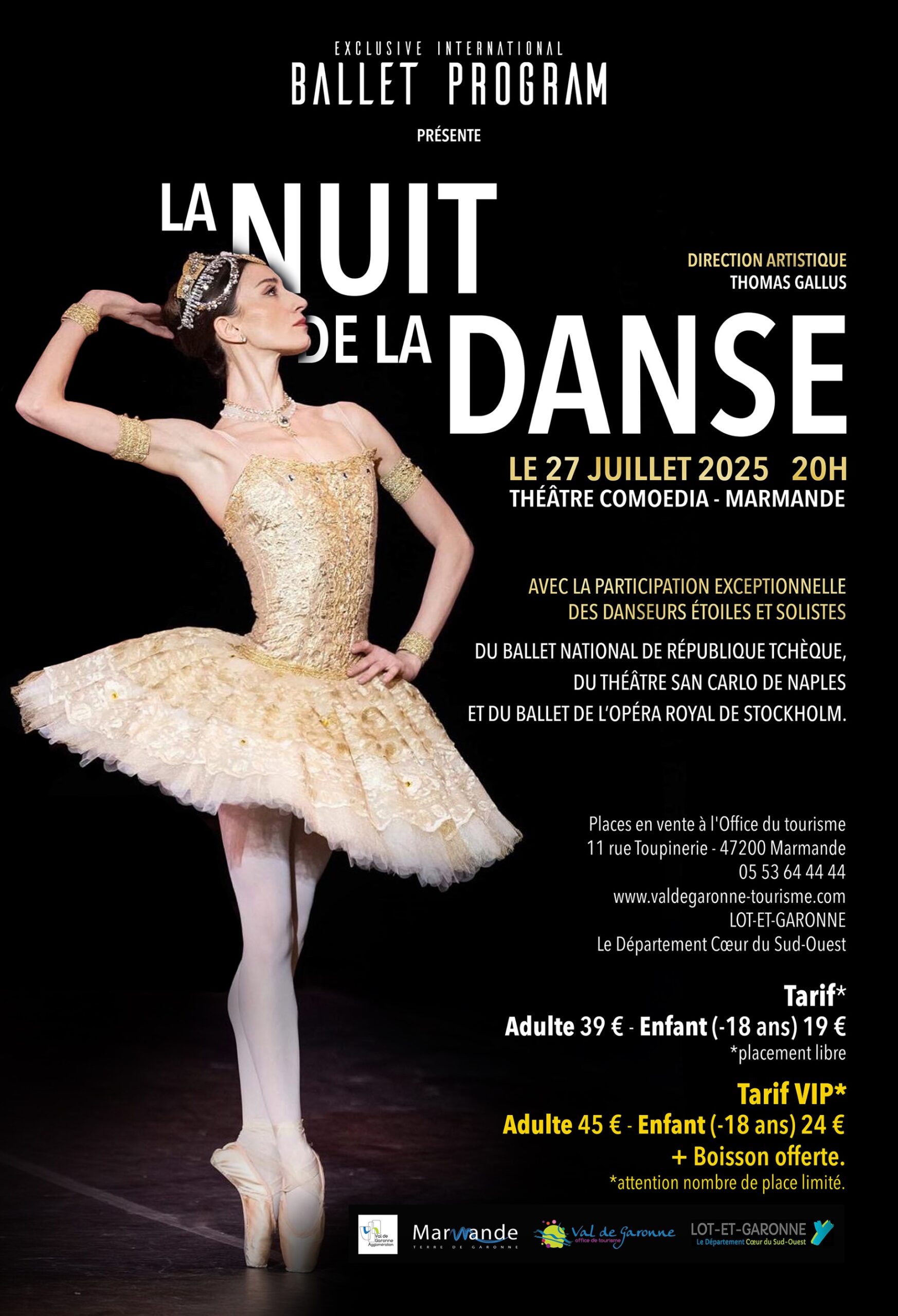 Marmande vous convie à la troisième édition de La Nuit de la Danse, un gala exceptionnel dédié aux amoureux de la danse classique, contemporaine et néoclassique. Le dimanche 27 juillet 2025 à 20h, rendez-vous au Théâtre Comœdia pour applaudir de jeunes talents et des danseurs étoilés issus des grandes compagnies européennes, tous réunis dans le cadre de l’Exclusive International Ballet Program.