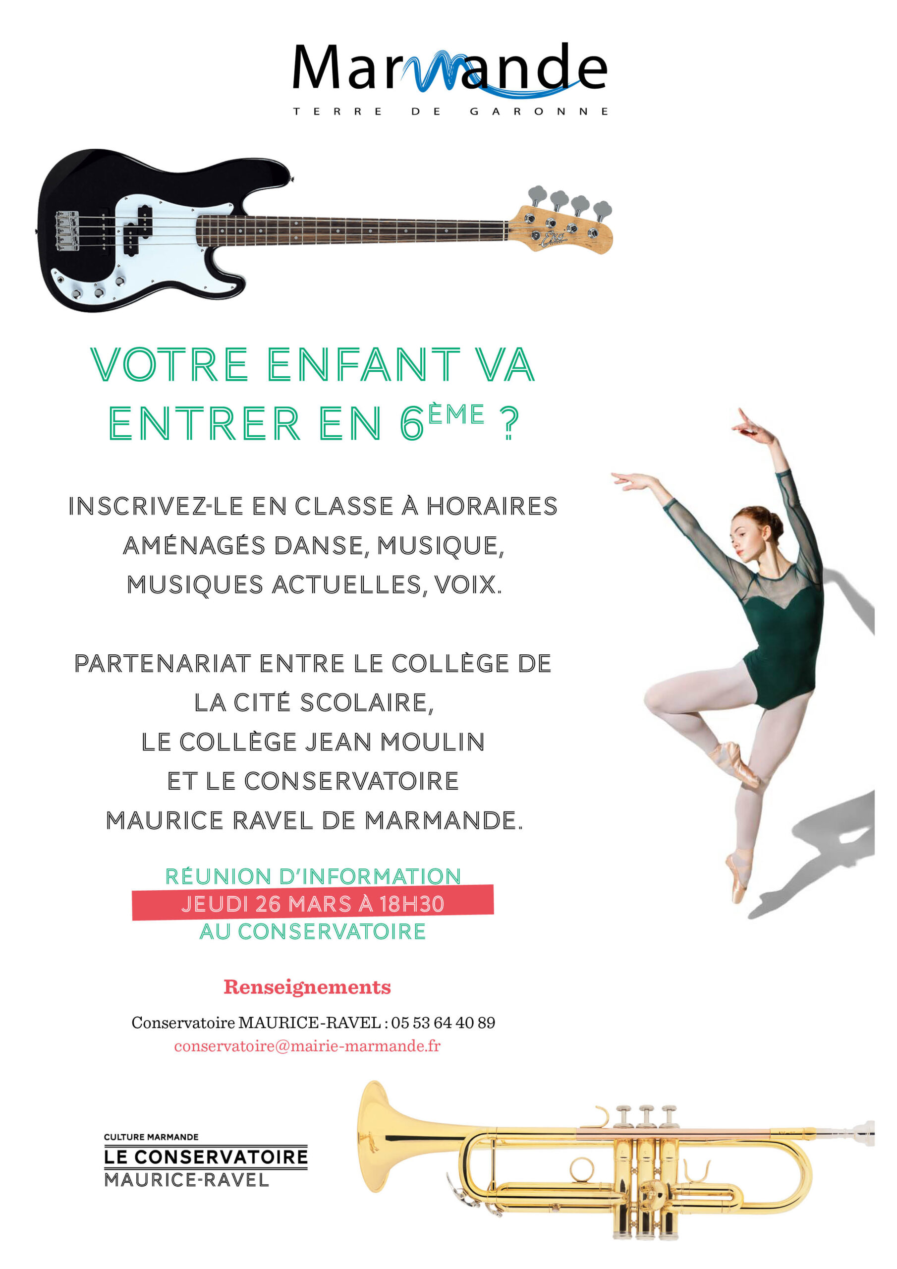 Votre enfant va entrer en 6ᵉ ? Découvrez les classes à horaires aménagés en danse, musique, musiques actuelles ou chant. Cette initiative est proposée en partenariat avec le Collège de la Cité Scolaire, le Collège Jean Moulon et le Conservatoire Maurice Ravel.