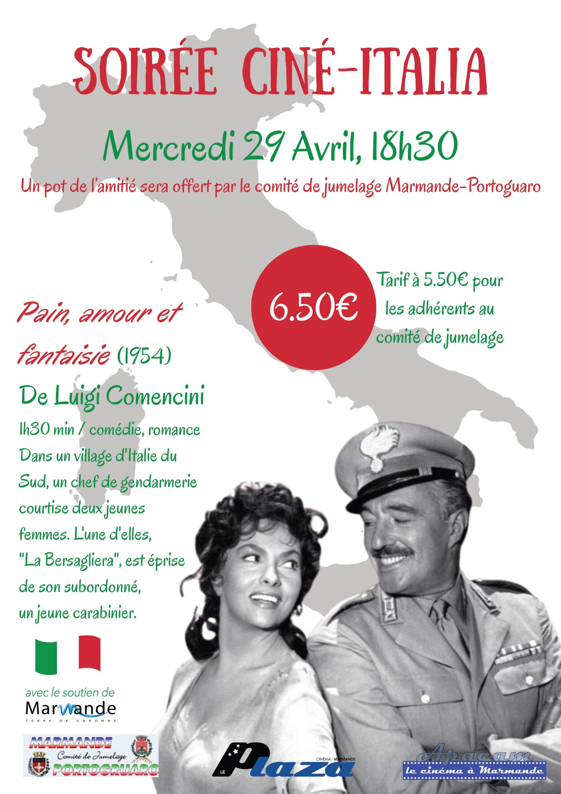 Dans le cadre de sa programmation culturelle, le comité de jumelage Marmande–Portogruaro vous invite à une soirée Ciné-Italia le mercredi 29 avril à 18 h 30, au cinéma Le Plaza. À l’issue de la projection, un pot de l’amitié sera offert aux participants par le comité de jumelage.