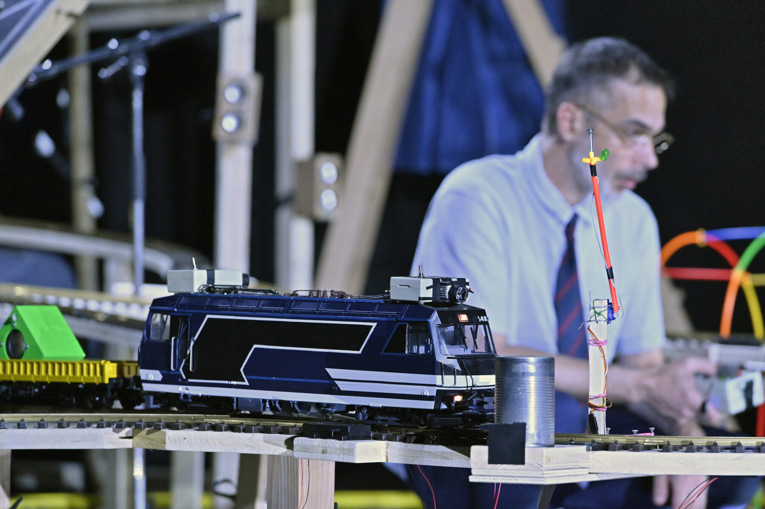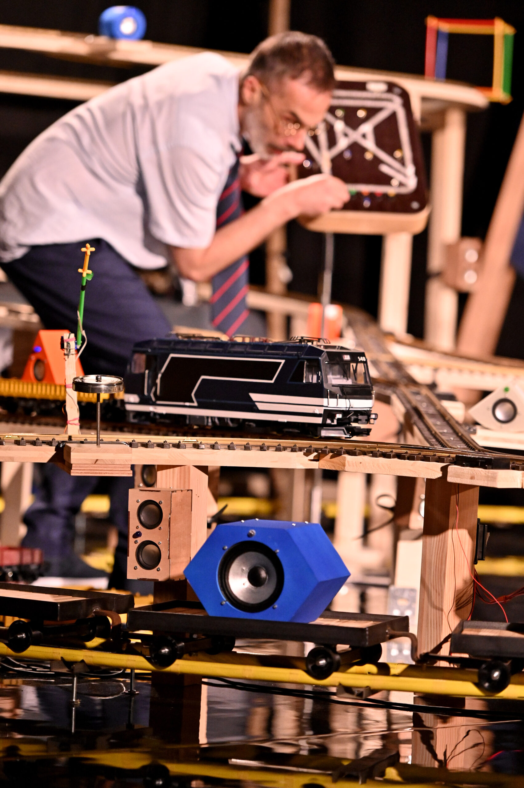 Symphonie pour trains électriques. Un circuit géant de trains électriques : ses passages à niveaux, ses aiguillages, ses tunnels et ses ponts. Et sa musique : le cliquetis du démarrage de la locomotive, le chuintement des wagons dans les virages, leur sifflement dans les descentes et le tchou-tchou évidemment ! Imaginez plusieurs trains comme autant d’instruments, le rythme des barrières, levées, baissées, faisant office de baguettes de batterie, ajoutez un musicien-beatbox et vous aurez une petite idée de Track, cet objet sonore et visuel conçu pour les petits par Céline Garnavault, qui émerveillera aussi les grands. Après Block, chef-d’oeuvre de détournement des boîtes à vache, Track ouvre une nouvelle voie joueuse à l’éveil des sens.