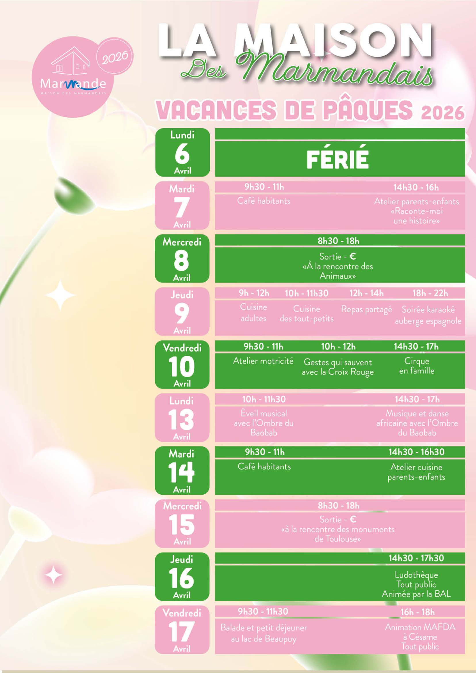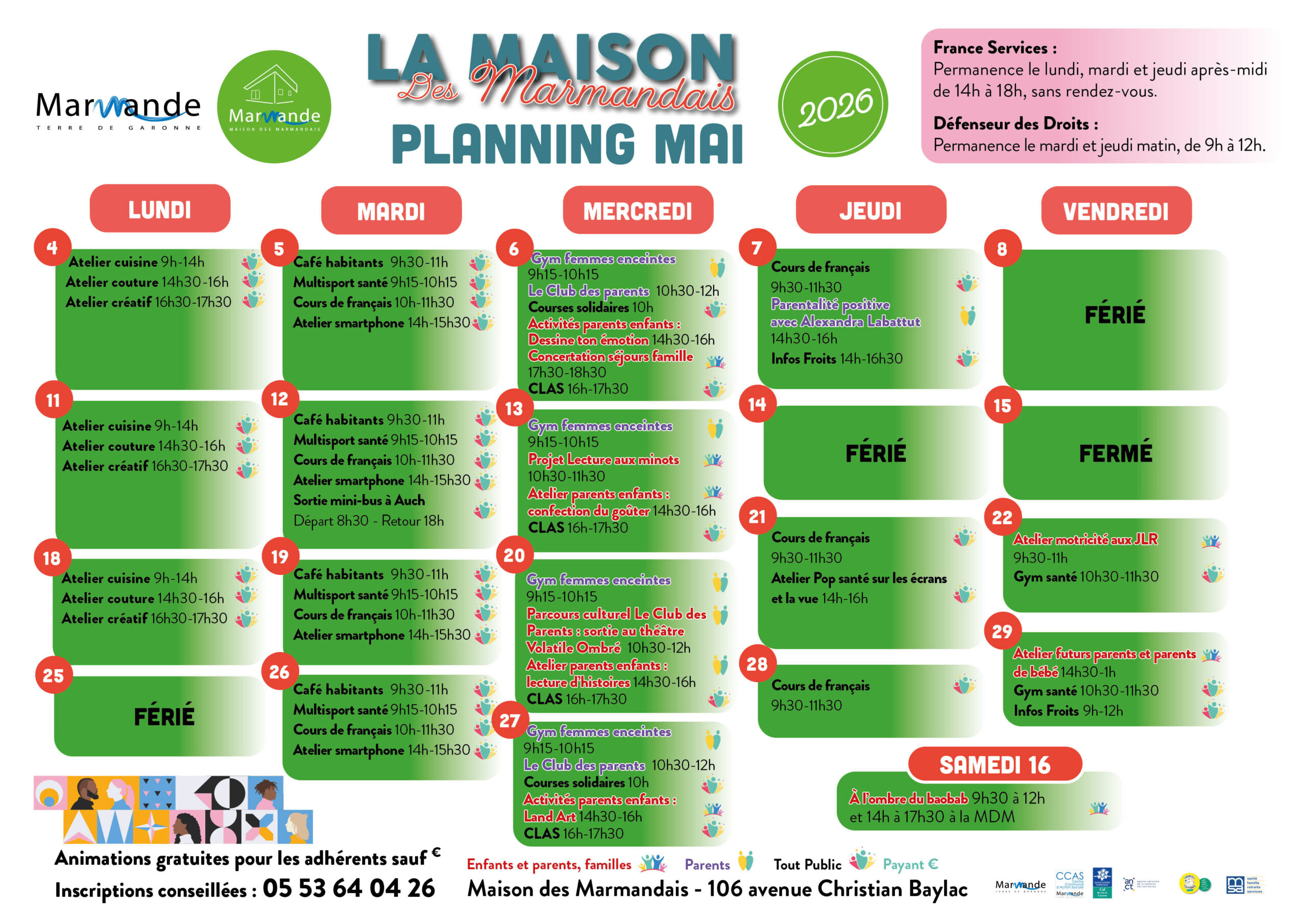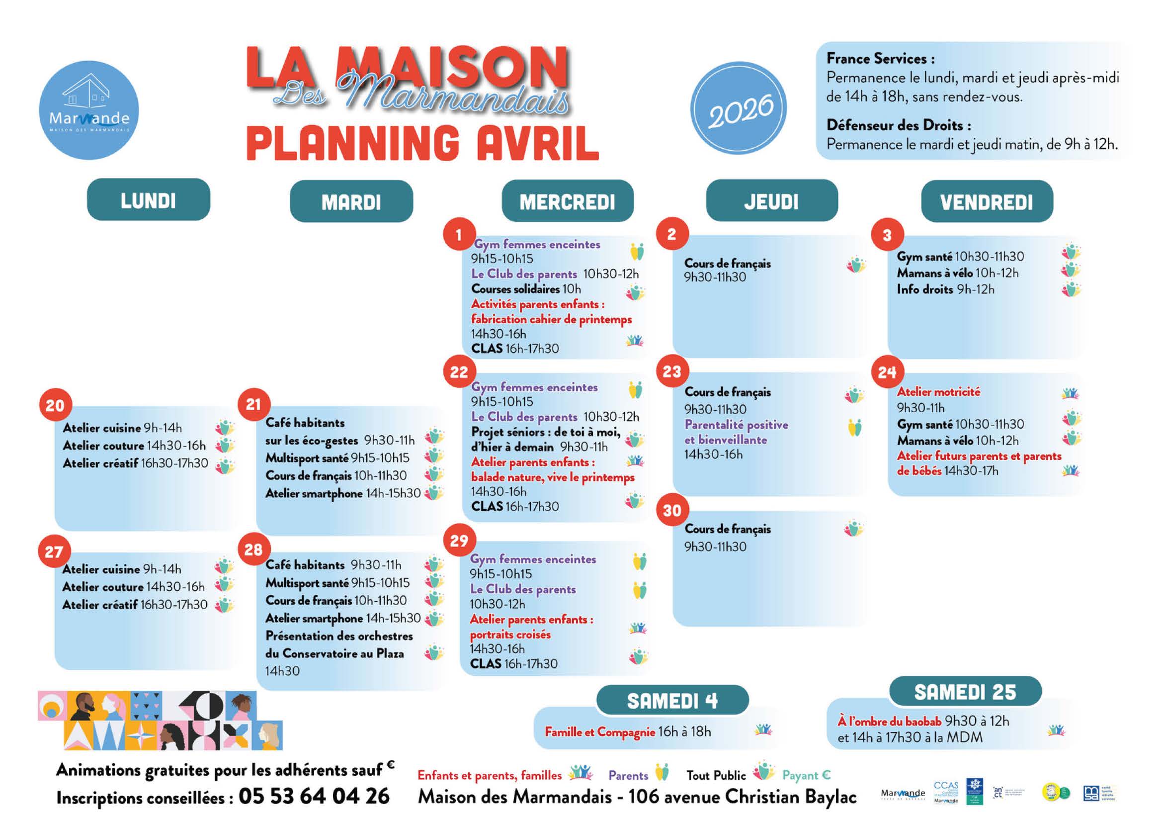 La Maison des Marmandais propose aussi des ateliers pour les familles que vous pouvez retrouver dans la rubrique «Petite Enfance – Enfance» ou «Vie périscolaire».